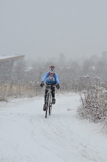 It snowed all morning and it was beautiful as the pictures show. (Thanks Scott!) I had almost zero brakes so I really couldn't use my skills. But I still plowed through the snow and only froze a little.